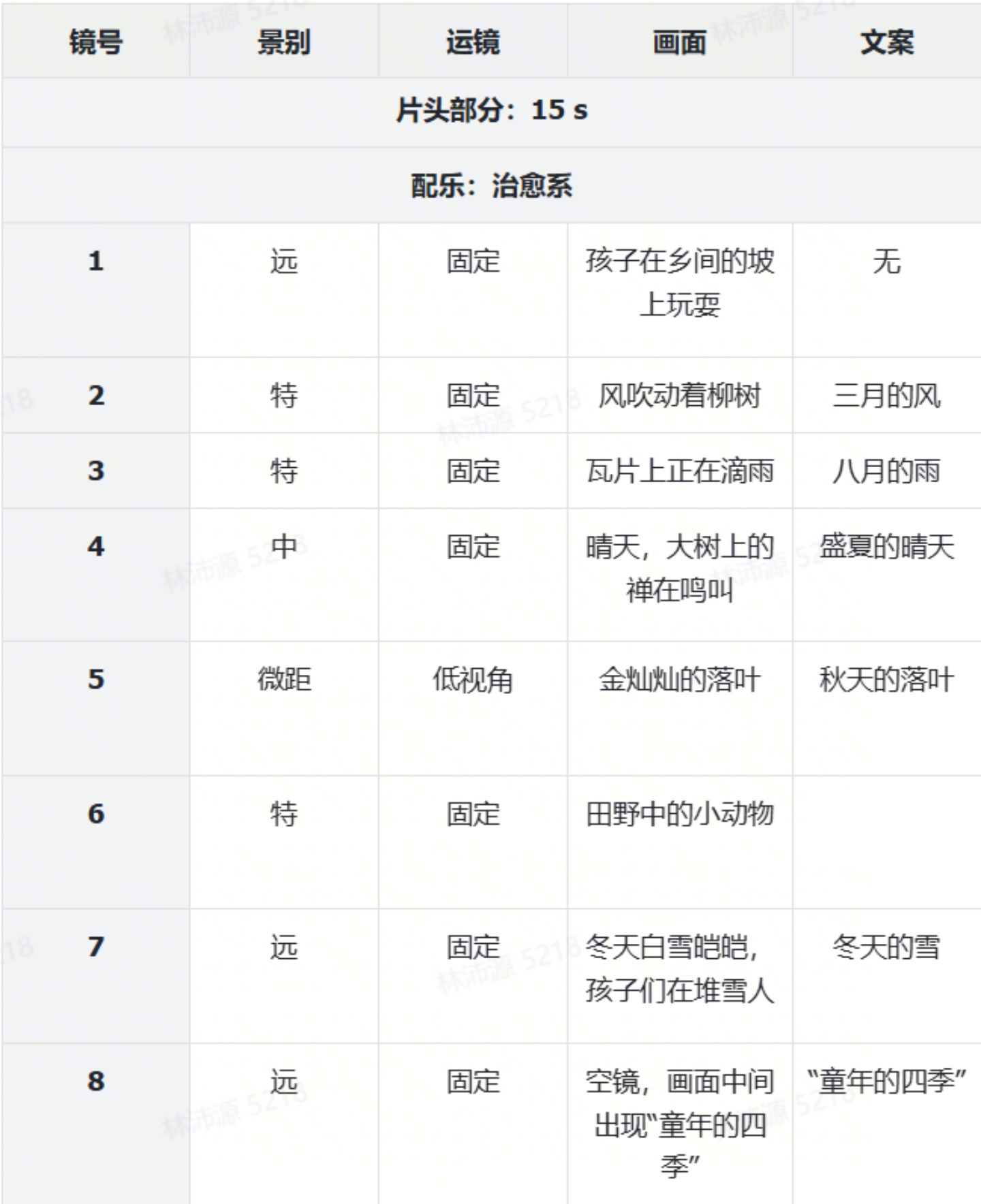 Reference the storyboard script of the featurette in @Image1, reference the storyboards, framing, camera movement, visuals, and copywriting of @Image1, to create a 15s healing intro sequence about the "Four Seasons of Childhood".